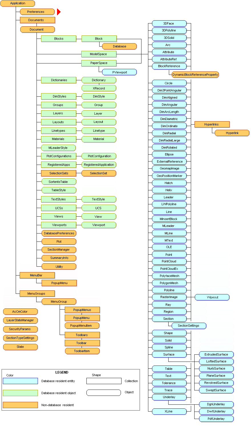 此分层结构的视图称为对象模型。它显示哪个对象提供对下一级对象的访问。AutoCAD对象模型如下图所示: ![]() 相关概念