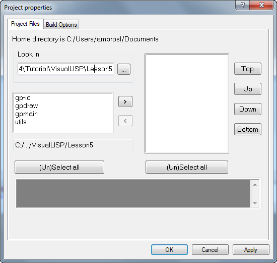 选择或取消选择“AutoLISP 源文件”和“项目文件”列表中的所有选定文件。