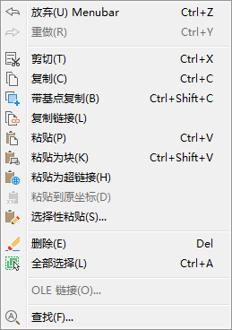 如果灰显,则与菜单项关联的宏和子菜单将不可访问。 以下样例通过将波浪号 (~) 添加到“名称”特性中值的前面来禁用“复制链接”菜单项。 ![]() 以下是将波浪号 (~) 添加到“名称”特性后,“复制链接”菜单项在“编辑”菜单上的显示结果。 ![]() DIESEL 字符串表达式可用于在每次显示菜单项时,根据条件启用或禁用该项。例如,“特性”窗格的“宏”特性中的 DIESEL 字符串表达式会在其他命令处于活动状态时禁用 MOVE 命令。 $(if,$(getvar,cmdactive),~)MOVE^C^C_move 也可以使用 AutoLISP menucmd 函数禁用或启用宏或 AutoLISP 应用程序中的项目。(在 AutoCAD LT 中不可用。) 标记菜单项可通过以下方法之一来标记菜单项: