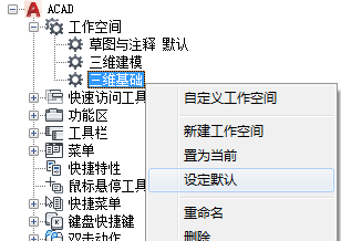 可以将 CUIx 文件中的工作空间标记为默认。将工作空间设置为默认可以确定,在第一次将 CUIx 文件加载到程序中后,或在使用 CUILOAD 命令加载 CUIx 文件之后,应该恢复此工作空间。
