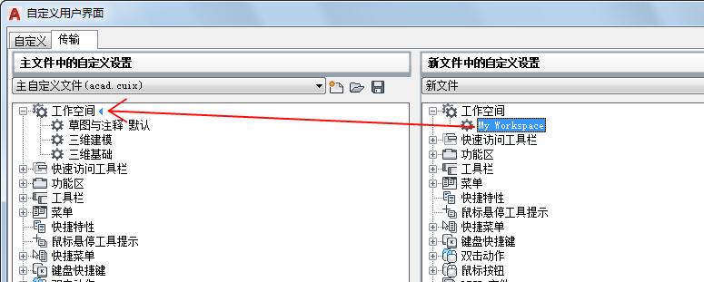 4. 在“<文件名> 中的自定义设置”窗格(右侧)中,将工作空间从 CUIx 文件拖动到“<文件名> 中的自定义设置”窗格(左侧)中主 CUIx 文件的“工作空间”节点。