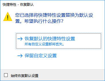 - 单击“恢复默认快捷特性设置”。