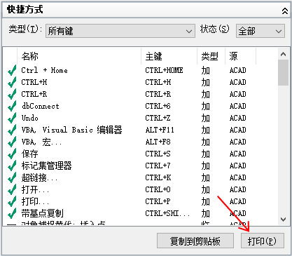 打印快捷键或临时替代键的列表