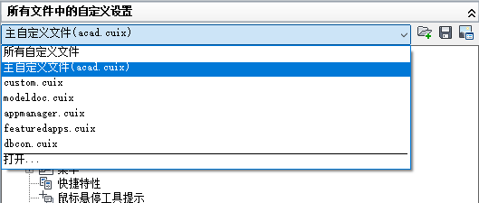 - 从“自定义”选项卡上的“<文件名> 中的自定义设置”窗格的下拉列表中,选择一个 CUIx 文件。
