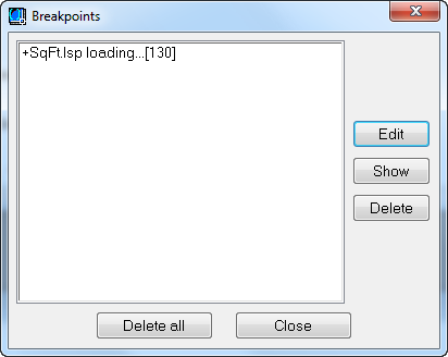 列出所有正在编辑的程序中的断点,而不仅仅是活动文本编辑器窗口中的程序。 注意:Visual LISP IDE 仅在 Windows 上可用。