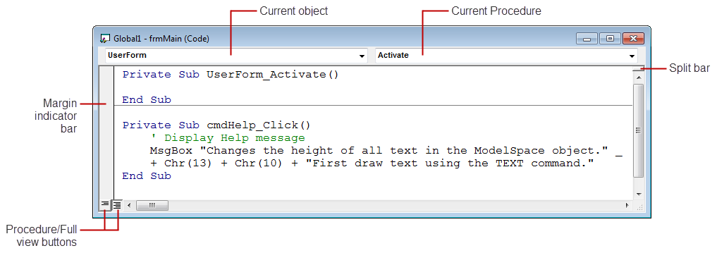 “代码”窗口包含两个下拉列表、一个拆分条、一个边距指示条以及“完整视图”和“过程视图”图标。 “代码”窗口顶部的两个下拉列表显示当前对象和过程。您可以通过更改这些下拉列表中的对象或过程来移动您的项目。 “代码”窗口右侧的拆分栏允许您水平拆分窗口。只需向下拖动此栏即可创建另一个窗口窗格。此功能允许您在同一模块中同时查看代码的两部分。若要关闭窗格,请将拆分栏拖回其原始位置。 边距指示器栏位于“代码”窗口的左侧。它用于显示代码编辑和调试期间使用的边距指示器。 “完整视图”和“过程视图”图标位于“代码”窗口的左下角,可将显示从一次仅一个过程切换为一次查看整个模块。 ![]() 父主题: |