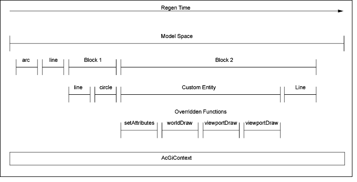 对于自定义图元,如果覆盖了非密封功能,AutoCAD 将传入相应的 AcGi 对象。这使AutoCAD能够像显示内置图元一样显示自定义图元。 subSetAttributes() 函数初始化实体的属性,例如颜色、图层和线型。该函数构建实体图形表示的部分,该部分可以独立于任何特定的模型空间视图或纸张空间视口上下文进行指定。然后,该函数生成实体图形的视图相关部分。如果实体的任何图形与视图相关,则必须返回并必须实现。相反,如果实体没有与视图相关的图形,则必须返回,并且自定义实体不会实现 。subWorldDraw()subViewportDraw()suWorldDraw()kFalsesuViewportDraw()subWorldDraw()kTruesubViewportDraw() 下图显示了重新生成具有两个视口的 AutoCAD 图形的顺序。在此示例中,图形包含两个块,即块 1 和块 2。块 1 被分解为它的组成部分,一条线和一个圆。块 2 由一个自定义实体组成。自定义图元被分解,以显示生成图形时调用函数的顺序: ![]() 该对象提供了一个通用上下文,可以在再生过程的所有部分访问该上下文。它提供有关再生的当前状态的信息。例如,在再生过程中,您可以随时从对象获取当前数据库。AcGiContextAcGiContext AcGi 的类层次结构如下: 基类封装了 和 的通用功能。基类封装了 和 的通用功能。如果需要,这些基类允许您编写可以处理这两种情况的更通用的代码。AcGiCommonDrawAcGiViewportDrawAcGiWorldDrawAcGiGeometryAcGiViewportGeometryAcGiWorldGeometry 父主题: |