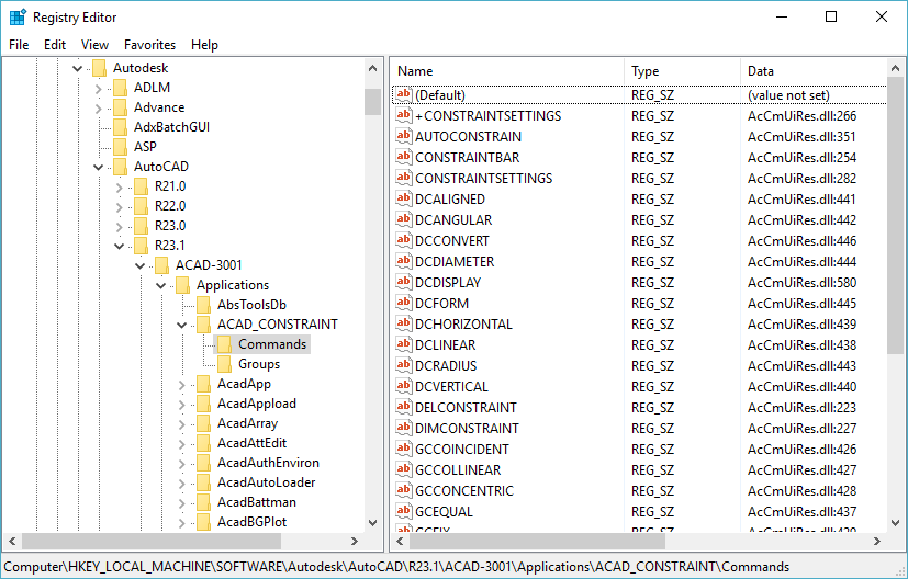 水平要求 适用于ObjectARX、.NET 和 ObjectDBX 模块 在注册表的 AutoCAD 部分中注册逻辑应用程序名称。(可选)请考虑向逻辑应用程序名称添加唯一前缀。 ObjectARX 应用程序示例: HKEY_LOCAL_MACHINE SOFTWARE Autodesk AutoCAD R23.1 ACAD-3001:409 Applications AsdkPolyCAD WXYZBathroom ABCDAnotherApp 注意:注册表项 ACAD-3001:409 特定于 AutoCAD 2020 - 英文版。值 ACAD-3001 将根据安装的基于 AutoCAD 的单一专业产品而有所不同,409 表示安装的语言。