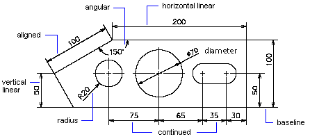 尺寸显示对象的几何测量值、对象之间的距离或角度或要素的 X 和 Y 坐标。 AutoCAD 提供了三种基本尺寸标注类型: