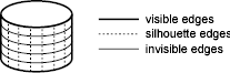 如果曲面不是弯曲的,或者查看目的不需要边,请指定 。对于曲面的硬边或可见折痕,请指定 。对于可以从某些视点看到的边或面,请指定 。影像可见性类型仅由 HIDE 命令识别;否则,它被解释为 .kAcGiInvisiblekAcGiVisiblekAcGiSilhouettekAcGiVisible 例如,在下面所示的实心圆柱体中,构成圆柱体边缘的边缘是可见的边缘。纬度边是不可见的边,因为它们从不用于观看目的。纵向边缘是轮廓边缘,因为从特定角度观察圆柱体时会使用它们。 ![]() 父主题: |