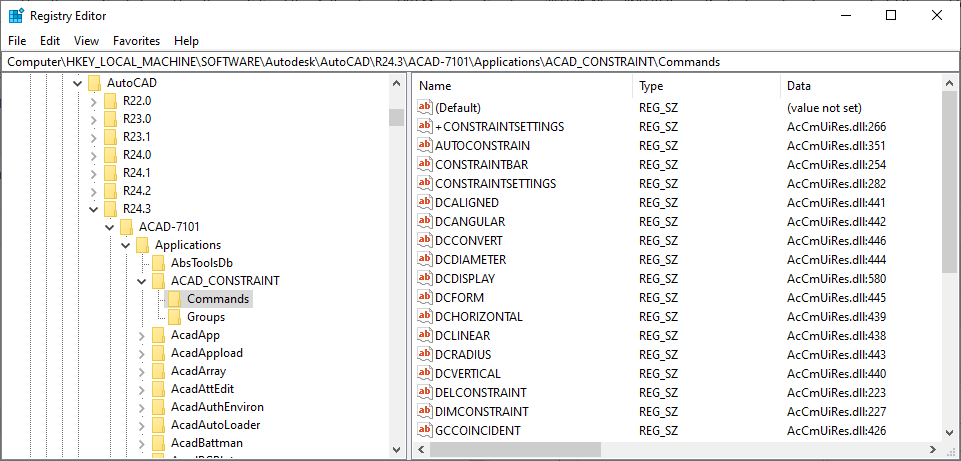 水平要求 适用于ObjectARX、.NET 和 ObjectDBX 模块 在注册表的 AutoCAD 部分中注册逻辑应用程序名称。(可选)请考虑向逻辑应用程序名称添加唯一前缀。 ObjectARX 应用程序示例: HKEY_LOCAL_MACHINE SOFTWARE Autodesk AutoCAD R24.3 ACAD-7101:409 Applications AsdkPolyCAD WXYZBathroom ABCDAnotherApp 注意:注册表项 ACAD-7101:409 特定于 AutoCAD 2024 - 英文版。值 ACAD-7101 将根据安装的基于 AutoCAD 的单一专业产品而有所不同,409 表示安装的语言。