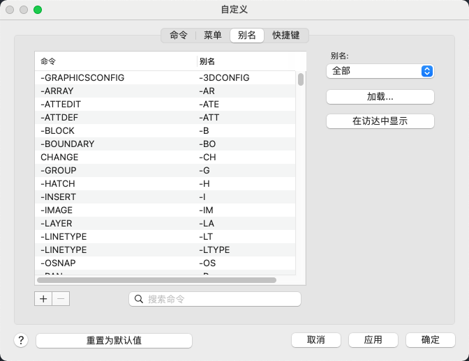 注: 对命令别名所做的更改将保存到 acaduser.pgp 文件(或 AutoCAD LT 的 acadltuser.pgp 文件)。