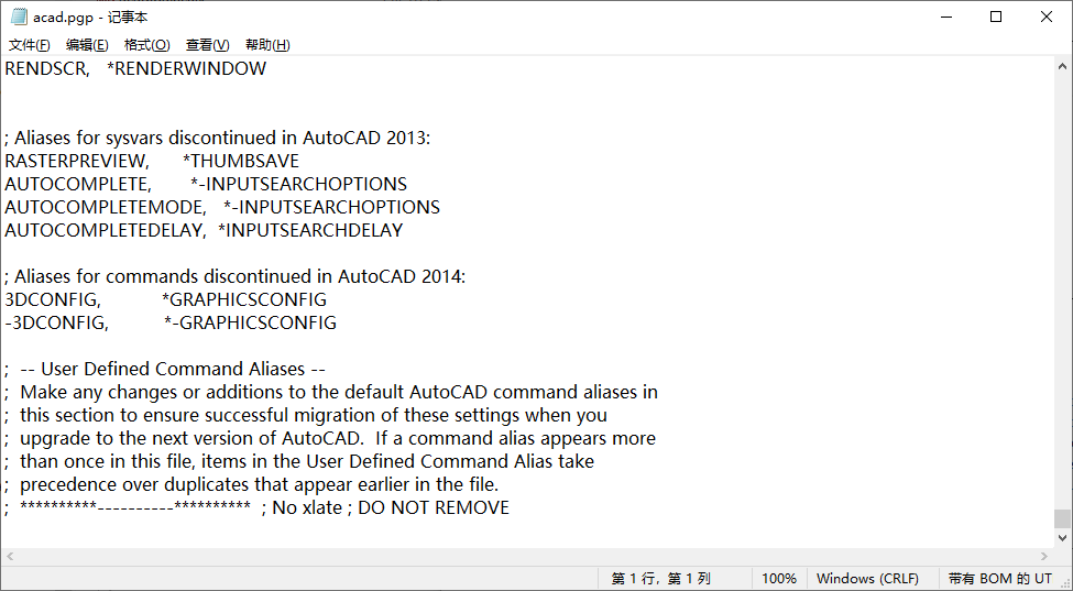 注: 如果要替换现有命令别名(例如,C 用于启动 COPY 命令,而不是 CIRCLE 命令),最好不要更改现有命令别名定义,而是在“用户定义的命令别名”部分下添加新条目。最后一个定义是产品加载的定义。