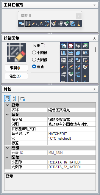 在开始自定义功能区选项卡和面板、快速访问工具栏和其他用户界面元素之前,您应当熟悉自定义用户界面 (CUI) 编辑器(可以使用 CUI 命令打开它)。“自定义”选项卡在默认情况下显示并分为三个窗格:“...中的自定义设置”、“命令列表”和“动态显示”窗格。