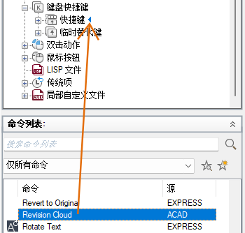 - 要创建快捷键,请在“命令列表”窗格中,将命令拖至“<文件名> 中的自定义设置”窗格的“快捷键”节点。