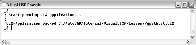 Visual LISP 控制台窗口显示与创建应用程序可执行文件(.vlx 文件)相关的消息。如果“生成应用程序”进程成功,则“控制台”窗口将显示 .vlx 的文件夹路径和文件名,如以下示例所示: ![]() 相关概念 |