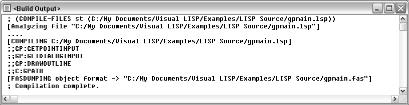 此过程的输出消息显示在两个 Visual LISP 窗口中;“生成输出”窗口和“控制台”窗口。“生成输出”窗口包含与将 AutoLISP 源代码编译为 .fas 文件相关的消息。在成功的编译中,输出如下所示: ![]() 编译器消息标识以下项: