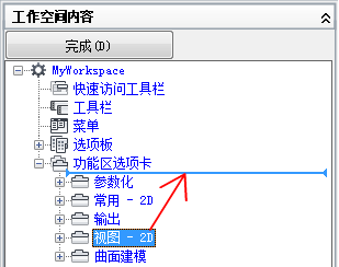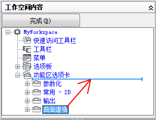 5. 在“工作空间内容”窗格中,单击“功能区选项卡”节点旁边的加号 (+) 以将其展开。