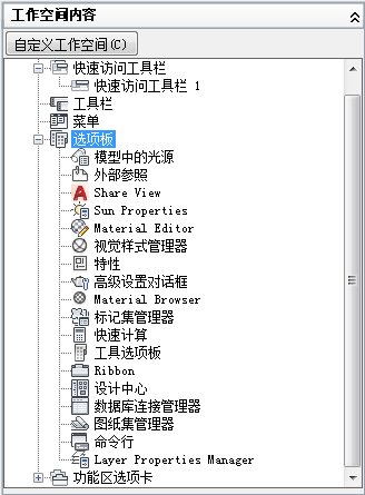 3. 在“工作空间内容”窗格中,单击“选项板”节点旁边的加号 (+) 以将其展开。