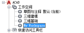 1. 在“自定义”选项卡上的“<文件名> 中的自定义设置”窗格中,单击“工作空间”节点旁边的加号 (+) 以将其展开。