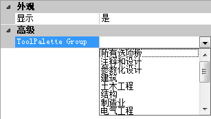 7. 在“特性”窗格的“高级”下的“工具选项板组”框中,单击下拉列表,然后选择要指定给功能区选项卡的工具选项板组。