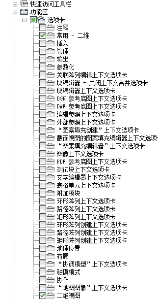 使用 CUI 编辑器来控制快速访问工具栏、功能区选项卡和面板、工具选项板、工具栏和下拉菜单的显示。