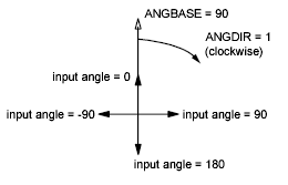 函数 、 和 暂停 用于在 AutoCAD 命令行上进行用户输入。它们仅返回与请求的值类型相同的值。getintgetrealgetstring 、 、 和 函数暂停以供用户在命令行上或从图形屏幕上选择的点进行输入。和 函数返回 3D 点值,并返回一个实际值。getpointgetcornergetdistgetpointgetcornergetdist 在命令行上输入角度值或由图形屏幕上选择的点定义的角度值时,两者都暂停。对于该函数,0 角始终向右:“东”或“3 点钟”。对于 ,0 角度是 ANGBASE 的值,可以设置为任意角度。两者都返回一个角度值(以弧度为单位),以弧度为单位,从底面(0 角)开始,等于 ANGBASE,而 for 向右。getanglegetorientgetorientgetanglegetanglegetorientgetanglegetorient 例如,ANGBASE 设置为 90 度(北),ANGDIR 设置为 1(顺时针方向以增加角度)。下表显示了代表性输入值(以度为单位)的返回值(以弧度为单位)。getanglegetorient