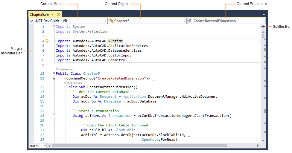 “代码”窗口包含两个下拉列表、一个拆分条和一个边距指示器条。 “代码”窗口顶部的两个下拉列表在左侧显示当前对象(类或窗体),在右侧显示当前对象的过程。您可以通过更改这些下拉列表中的对象或过程来移动项目。 “代码”窗口右侧的拆分栏允许您水平拆分窗口。只需向下拖动拆分栏即可创建第二个窗口窗格。此功能允许您在同一代码模块中同时查看代码的两个部分。若要关闭窗格,请将拆分栏拖回其原始位置或双击它。 边距指示器栏垂直位于“代码”窗口的左侧。它用于显示代码编辑和调试期间使用的边距指示器。 ![]() 父主题: |