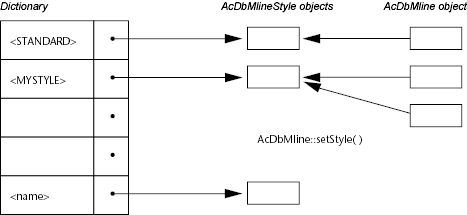 MLINE 样式字典包含类 的对象。如下图所示,每个类的对象都具有关联的 MLINE 样式,该样式指定多线的属性,例如偏移量、颜色和线型。AcDbMlineStyleAcDbMline