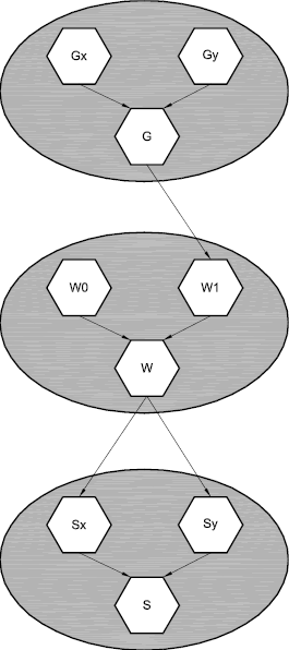 在“对象间关系评估”中介绍的圆示例中,应用程序可以将夹点的 X 和 Y 坐标值表示为图形中的节点(Gx 和 Gy)。width 参数可能由端点的两个节点(W0 和 W1)表示。最后,缩放操作 (S) 可能由单个节点表示。生成的图形如下图所示: ![]() DAG 和评估类的应用并不局限于动态模块。下图显示了如何将图形应用于数学表达式的计算。二进制运算节点依赖于值节点或其他二进制运算符节点。计算二进制运算符节点将对前面节点的值执行指示的操作,并返回计算值。因此,将 a 和 b 乘以乘法 (*) 二元运算符节点,从乘积中减去 3 乘以减法 (-) 二进制运算符,并将此减法的结果除以 7 以产生最终结果 x。 ![]() 在下图中,可连接节点表示动态块实例的创作元素。每个节点都可以根据可连接属性提供和接受连接。当一个节点找到另一个公开所需可连接属性的节点时,可以建立连接。任意数量的节点都可以连接到单个可连接节点。 夹持元件 (G) 出现在图的顶部气泡中。Gx 和 Gy 是 G 的可连接属性,用于跟踪夹具在 XY 平面中的运动。宽度参数 (W) 由中间气泡表示,提供连接 W0 和 W1,用于维护 width 参数的先前值和当前值。计算 W 时,表达式会计算宽度的变化,并将结果公开为可连接属性。底部气泡中的刻度动作 (S) 提供表示 X 和 Y 刻度因子的 Sx 和 Sy 可连接属性。 ![]() 当手柄移动时,其 Gx 和 Gy 值会更新。width 参数 (W) 只需要一个 X 值,并查询 G 的 Gx 属性。确认此属性后,W1 属性将连接到 Gx。评估 Gx 时,将更新 W1。然后通过从 W1 中减去原始 X 值 (W0) 并将差值除以原始宽度来计算宽度变化的百分比。此百分比公开为 W 可连接属性。 若要均匀缩放圆,X 和 Y 比例因子必须相等。因此,缩放操作组件 (S) 将 Sx 和 Sy 属性连接到 W 可连接属性。对 W 的评估导致刻度动作 S。Sx 和 Sy 刻度属性组合在一起,根据夹持的移动和由此产生的宽度变化来执行刻度操作。 父主题: |