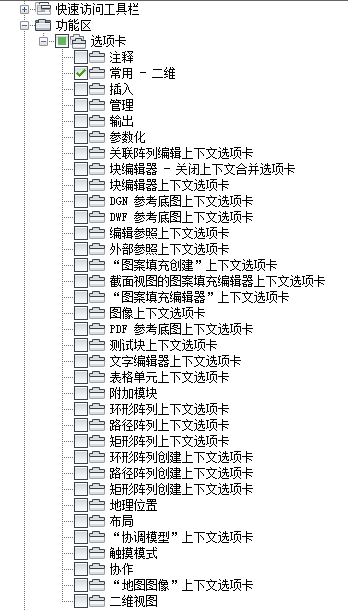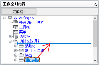 - 在“工作空间内容”窗格中,单击“功能区选项卡”节点旁边的加号 (+) 以将其展开。