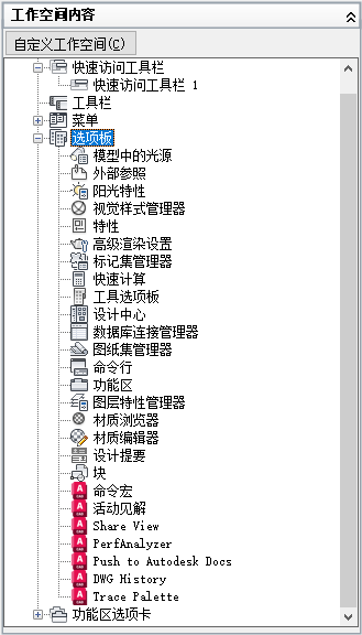 - 在“工作空间内容”窗格中,单击“选项板”节点旁边的加号 (+) 以将其展开。