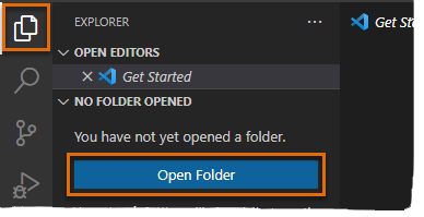 3. 在 Visual Studio Code 中的“活动栏”上,单击“资源管理器”,然后单击“打开文件夹”(或单击“文件”菜单>“打开文件夹/打开”)。
