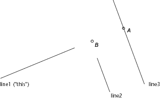 例如,假设图形包含下图中所示的三条线。Line1 是“this”,line3 是参数实体。如果交集类型为 ,则返回点 A,作为 line1 (“this”) 在延长 line1 时与行 3 相交的点。如果交集类型为 且 line2 是参数实体,则不会返回任何数据,因为即使扩展了 line2,line2 也不会与 line1 相交。如果交集类型为 且 line2 是参数实体,则返回点 B。如果交集类型为 且 line2 是参数实体,则不返回任何数据。kExtendThiskExtendArgumentkExtendBothkExtendNone ![]() 该函数是具有两种形式的重载函数。第二种形式采用一个附加参数,该参数是用于确定两个实体的表观交集的投影平面。以下是函数的签名:intersectWith()intersectWith() virtual Acad::ErrorStatus